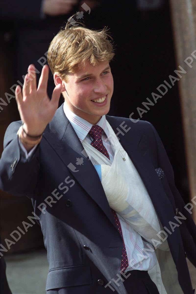 Prince William, whose left arm is in a sling from a recent broken finger operation, attends the christening of Prince Konstantine Alexios, six-month-old son of Crown Prince and Princess Pavlos of Greece