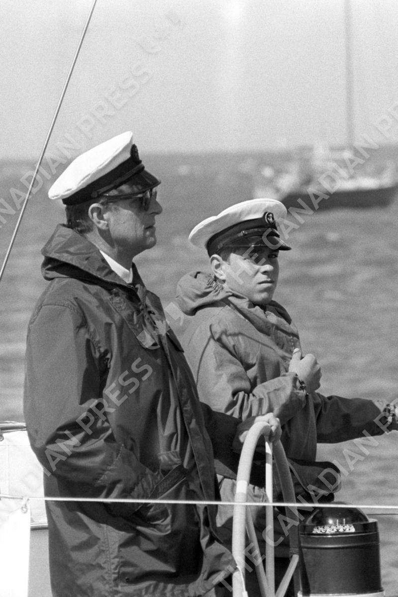 The Duke of Edinburgh and Prince Andrew (13) on board the chartered ocean yacht Yeoman XIX at Cowes. The young prince is being initiated into Cowes week racing, and wears a white peaked cap and self-inflatable jacket like his father.