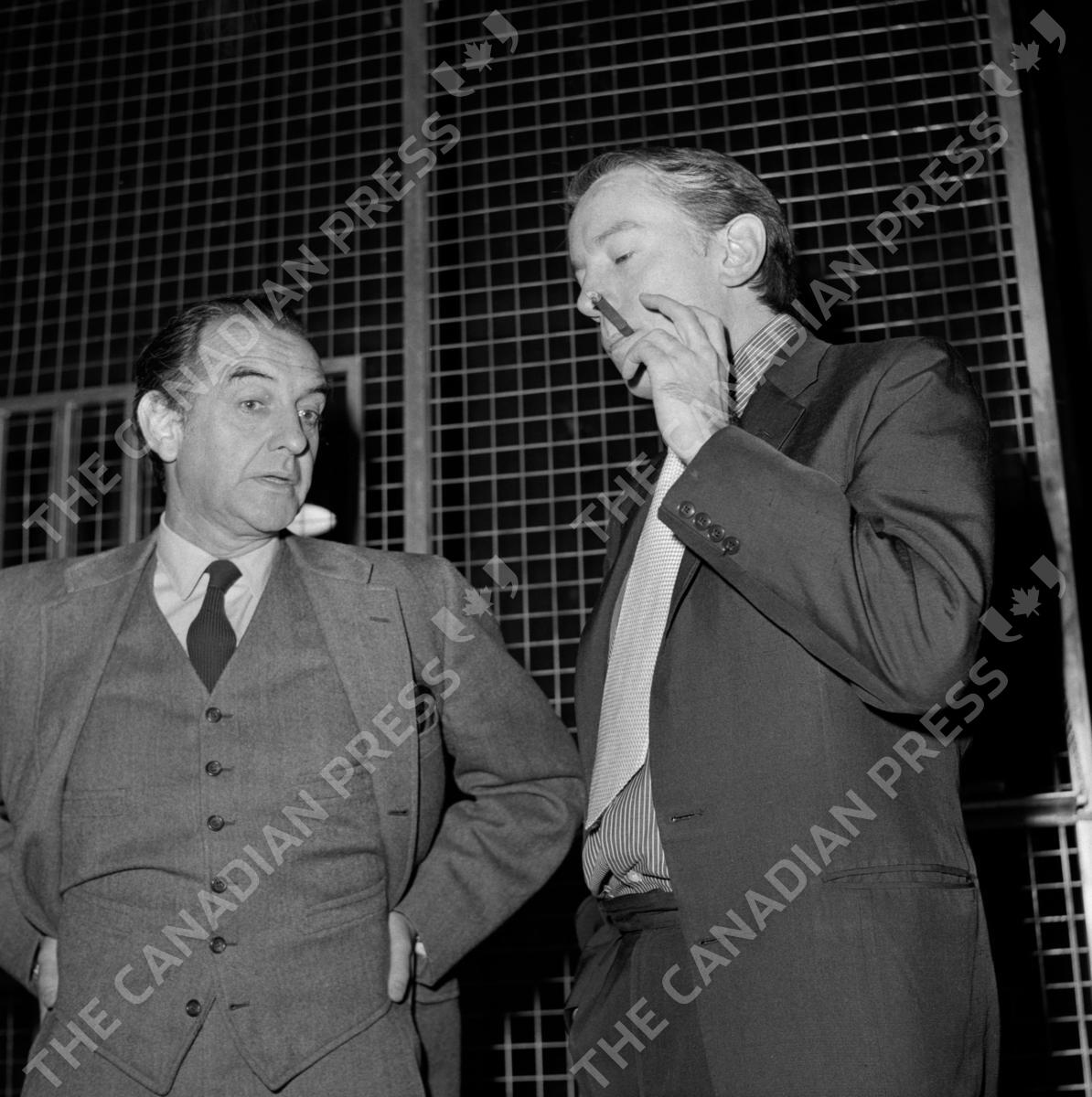 Playwright Kenneth Tynan (right) and actor Basil Langton seen at the Comedy Theatre, Panton Street, London, during the rehearsal of Rolf Hochhuth's play "Soldiers."
