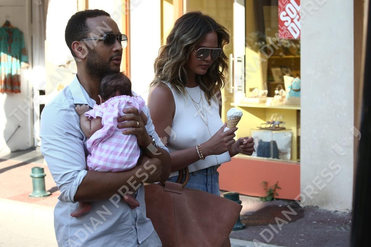 Chrissy Teigen with husband John Legend and their baby Luna Simone strolling in Saint Tropez, France, on July 25, 2016. Photo by ABACAPRESS.COM