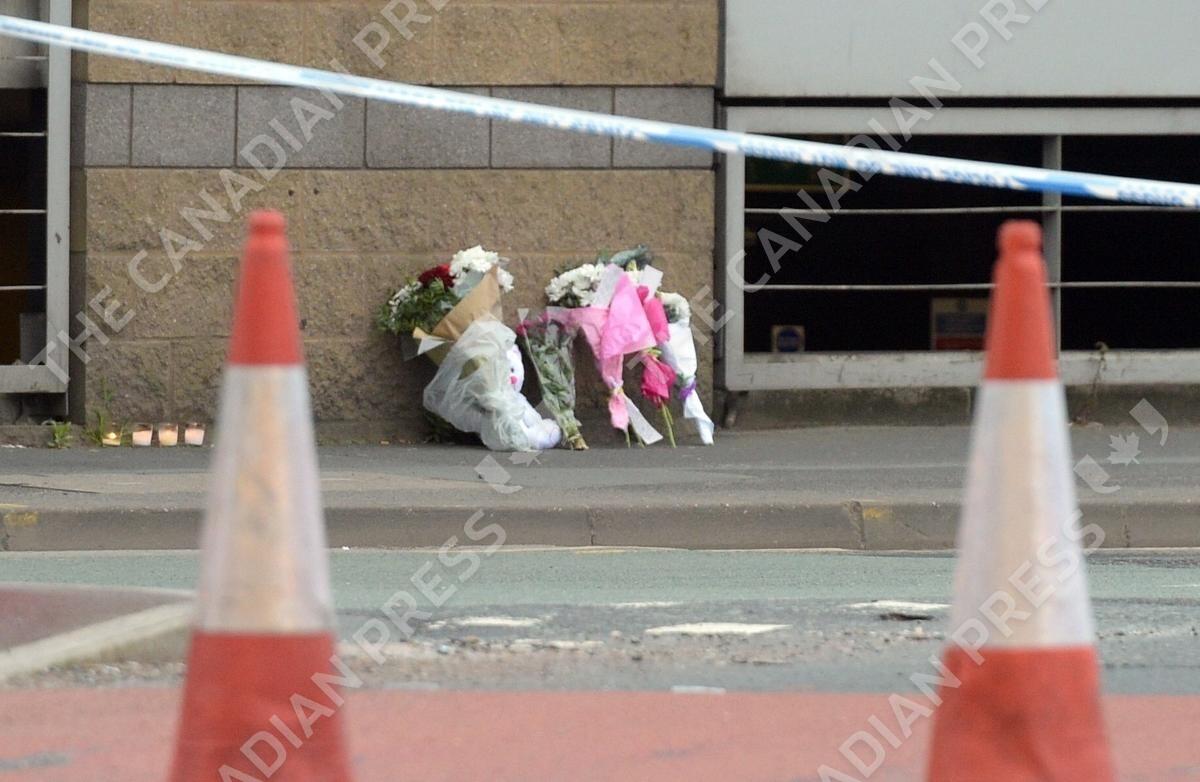 Flowers left close to the Manchester Arena where a suicide bomber killed 22 people leaving a pop concert at the venue on Monday night.