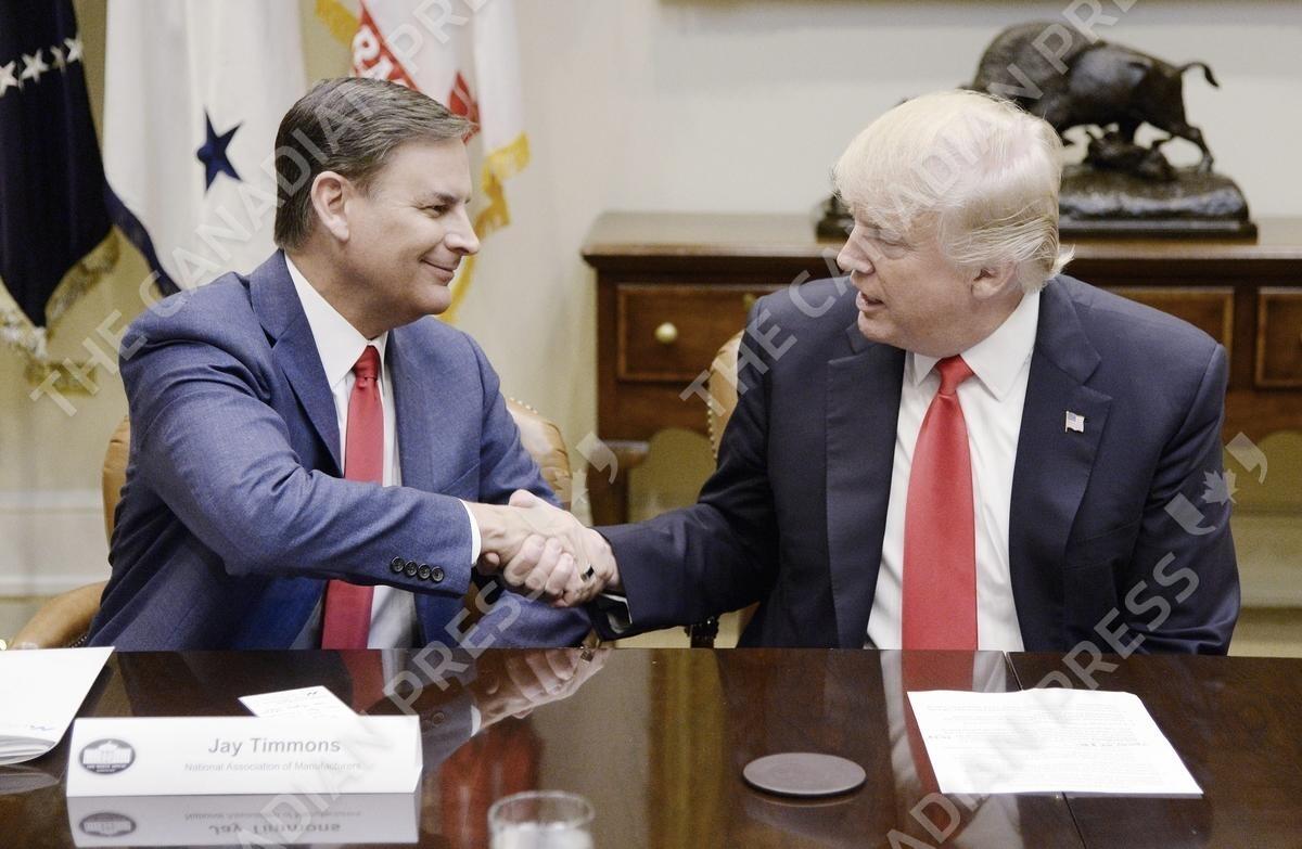 U.S. President Donald Trump checks hands with Jay Timmons during a meeting with the National Association of Manufacturers in the Roosevelt Room of the White House March 31, 2017 in Washington, DC. .Photo by Olivier Douliery/Abaca