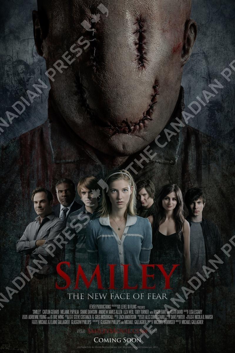 SMILEY, l-r: Roger Bart, Keith David, Shane Dawson, Caitlin Gerard, Andrew James Allen, Melanie Papalia, Toby Turner on US poster art, 2012, ©AMC Theatres/courtesy Everett Collection