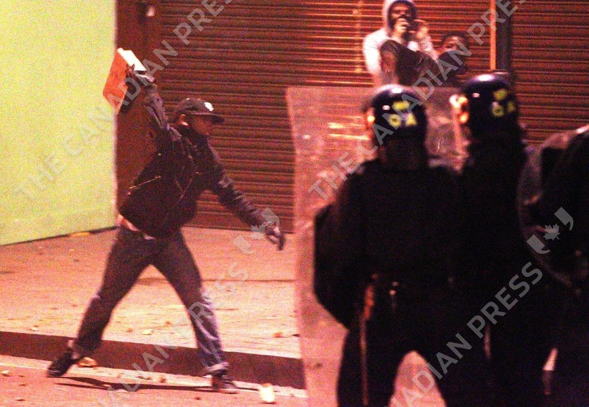 Previously unseen photograph dated 07/08/11 of the summer riots. Youths throw objects at riot police during the first night of the summer riots, in Tottenham, London.