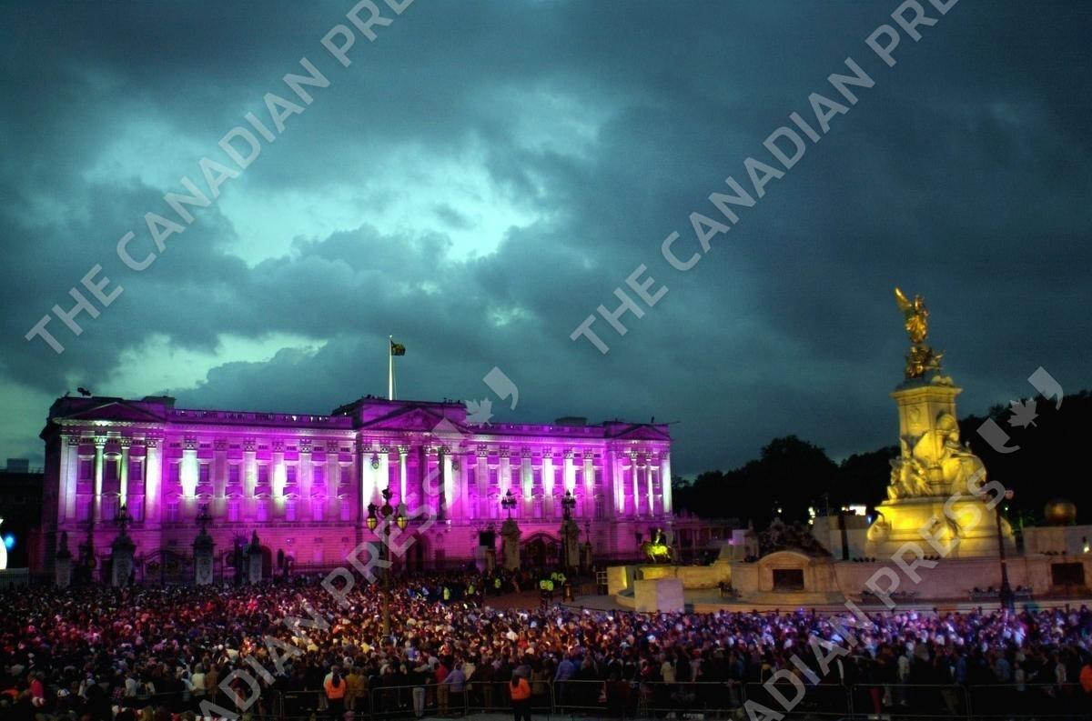 Coloured lights change the appearance of the facade of Buckingham Palace in London commemorate Britain's Queen Elizabeth's Golden Jubilee. Earlier, some 12,000 people had watched the Party in the Palace - the second concert to be held in the grounds in three days. * and a crowd estimated by police as up to one million strong gathered outside to enjoy the music. On Tuesday she will travel to the St Paul's for a service of thanksgiving.