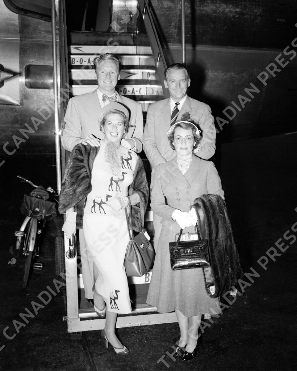 Film actors Van Johnson, left, and Douglas Fairbanks and their wives at Heathrow Airport as they were about to leave in a BOAC Stratocruiser for New York.