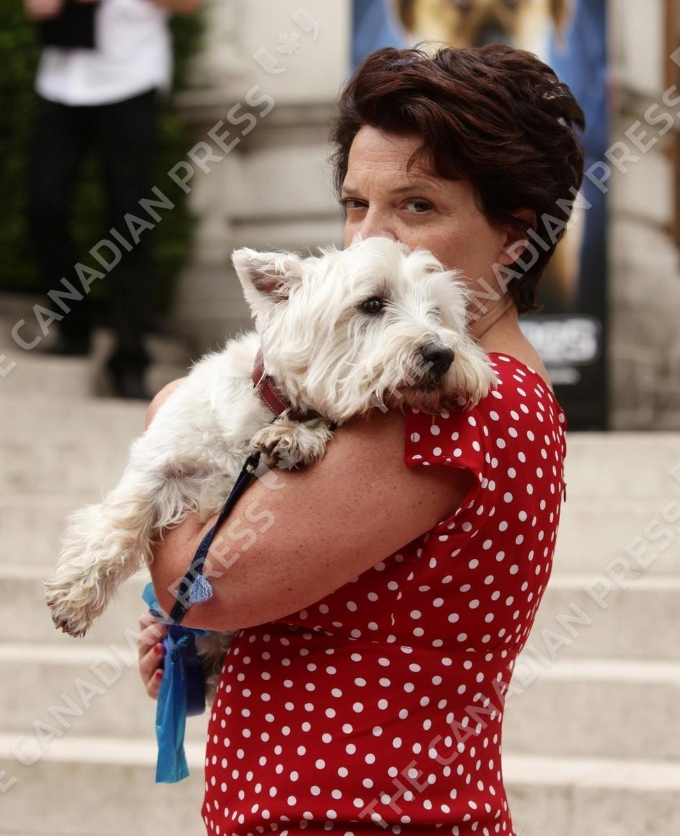Lulu Guinness with her dog Woffle at the gala screening of Cats & Dogs: The Revenge Of Kitty Galore, at Holland Park Theatre in London.