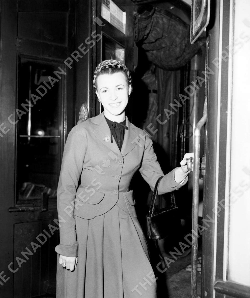 Actress Claire Bloom boarding the Mauretania boat train for Southampton at Waterloo Station. She was on her way to America to star in Charlie Chaplin's new film 'Limelight'.