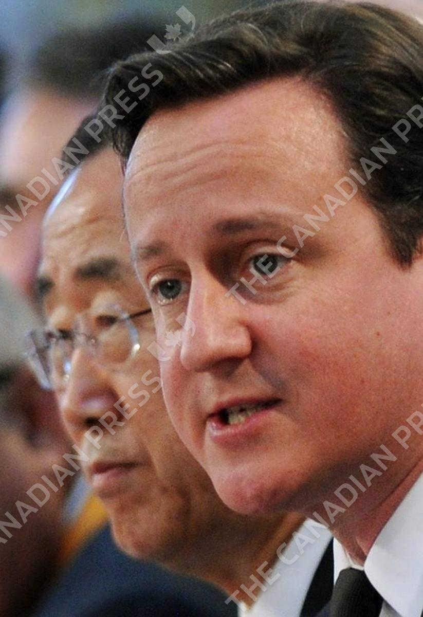 Britain's Prime Minister David Cameron speaks as he sits alongside U.N. Secretary-General Ban Ki-Moon, at the London Conference on Libya, at Lancaster House in London, Tuesday March 29, 2011. U.N. Secretary-General Ban Ki-Moon, U.S. Secretary of State Hillary Rodham Clinton, the Arab League, NATO chief Anders Fogh Rasmussen and up to 40 foreign ministers were attending the talks, seeking to ratchet up the pressure on Moammar Gadhafi to quit. Opening the talks, Britain's Prime Minister David Cameron said the conference would sketch out how the world could help Libya on a path to a post-Gadhafi rule.(AP Photo/Stefan Rousseau, pool)