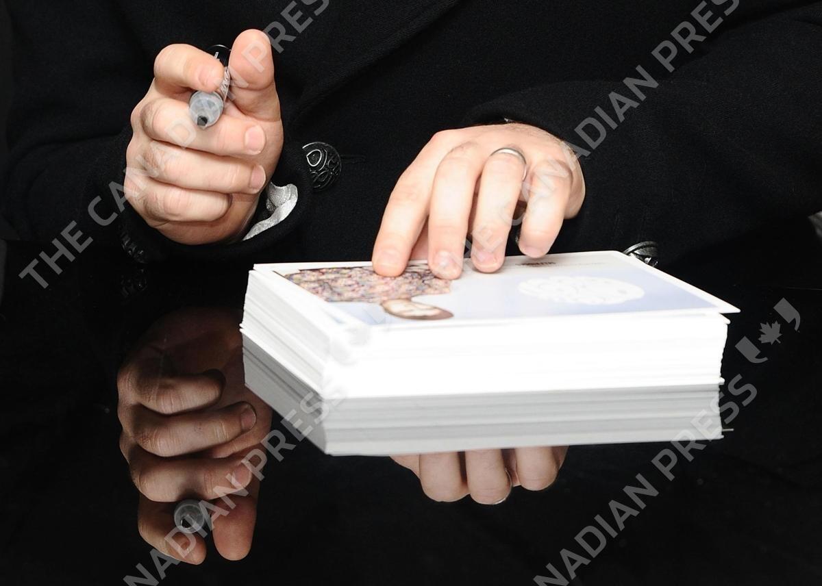 The hands of Liam Gallagher at a launch for his new clothing range, Pretty Green, at Selfridges in London.