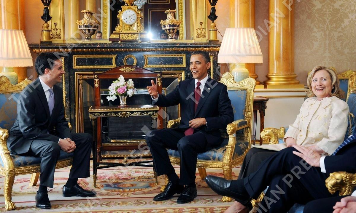 US President Barack Obama meets with Britain's Labour Party leader Ed Miliband as US Secretary of State Hillary Rodham Clinton looks on at Buckingham Palace in central London, Tuesday May 24, 2011. Obama is on a two day state visit to Britain. (AP Photo/Stefan Rousseau, Pool)