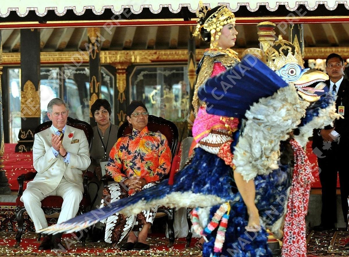 The Prince of Wales sits with His Excellency Sri Sultan Hamengkubowono X , as they watch a traditional dance where two princesses compete for the love of a king, at the Kraton Palace, Yogyakarta Indonesia's ancient former royal capital.