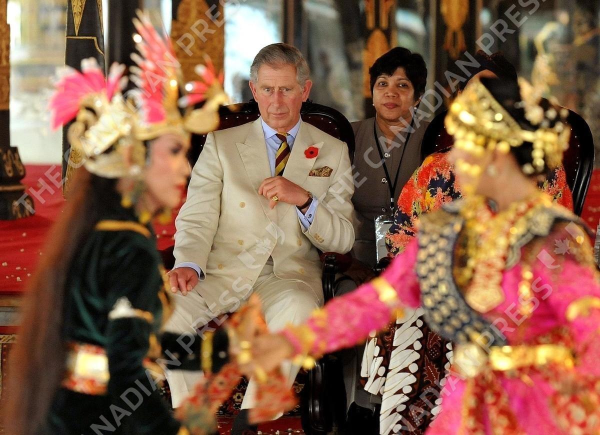 The Prince of Wales sits with His Excellency Sri Sultan Hamengkubowono X (obscured), as they watch a traditional dance where two princesses compete for the love of a king, at the Kraton Palace, Yogyakarta Indonesia's ancient former royal capital.