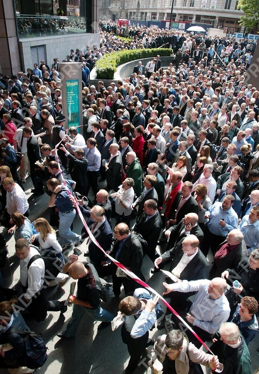 Commuters surge towards Liverpool Street Station as it re-opens, after a terror attack at 8.51am, when a bomb exploded in the tunnel near the station.