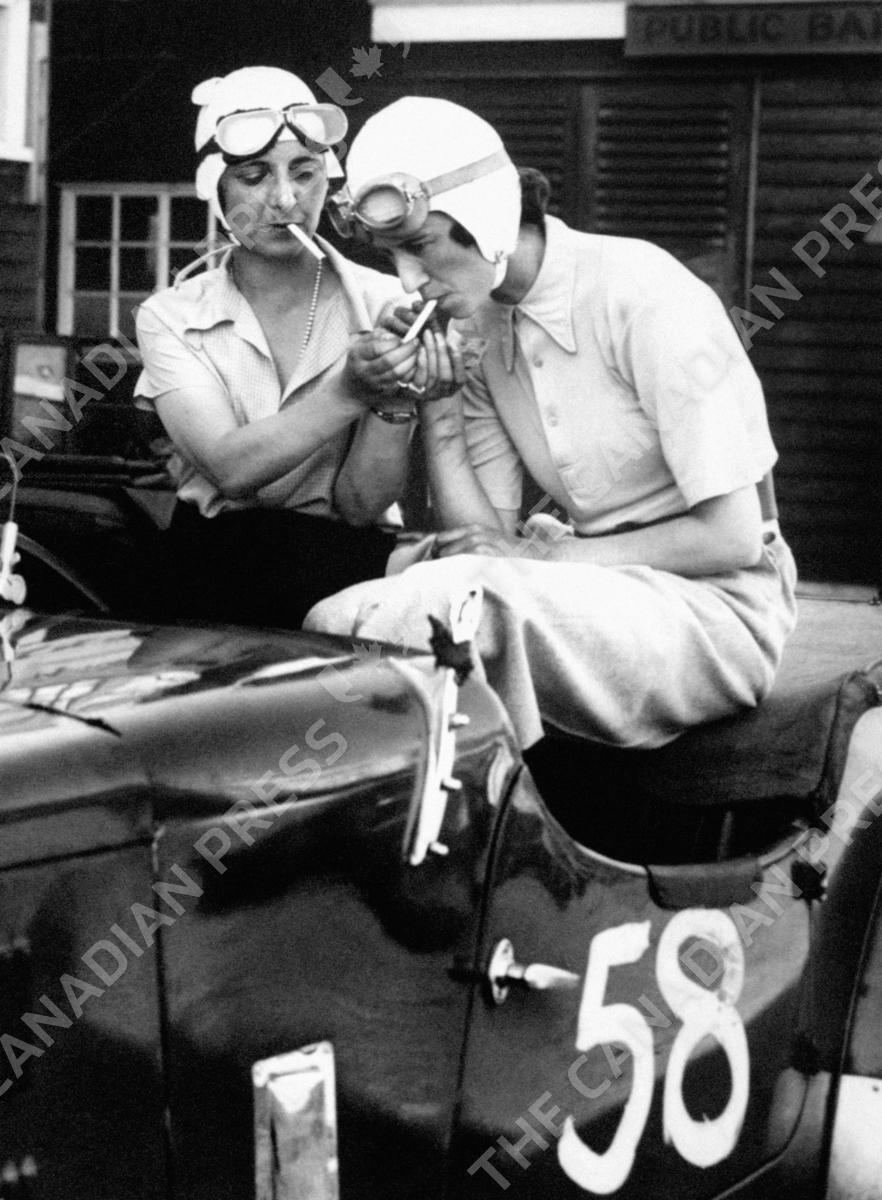 Mrs Gordon Simpson and the young Australian racing driver, Joan Richmond, sitting in Miss Richmond's 1921 3-litre G.P. Ballot racer, partaking in a cigarette before the start of a race.
