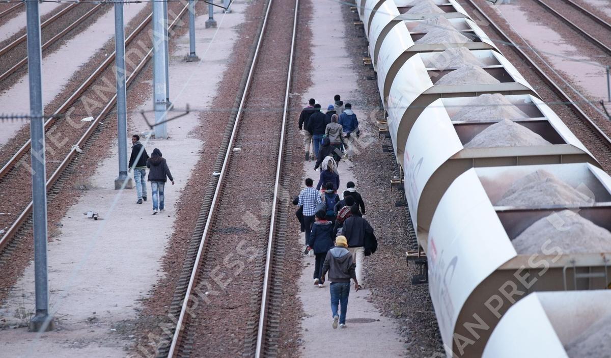 Migrants make their way along tracks near the Eurotunnel site at Coquelles in Calais, France.