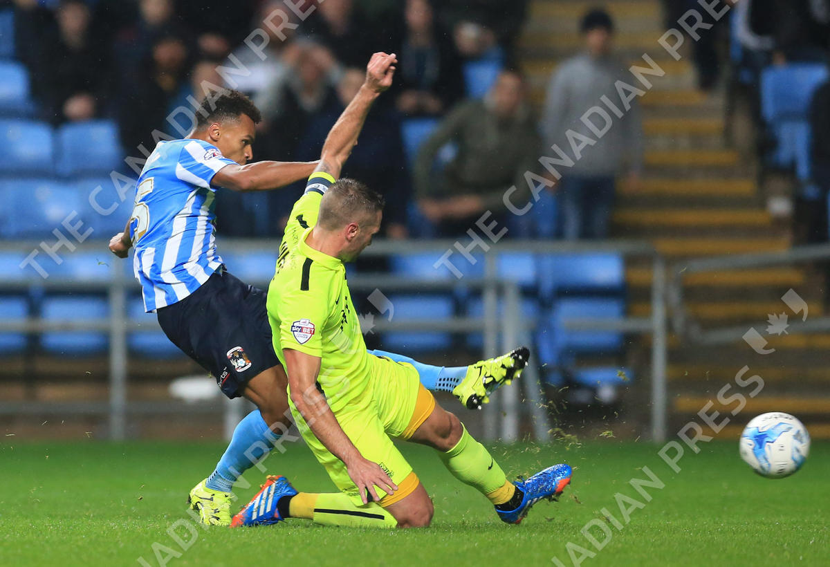 Coventry City's Jacob Murphy (left) has a shot on goal against Southend United.