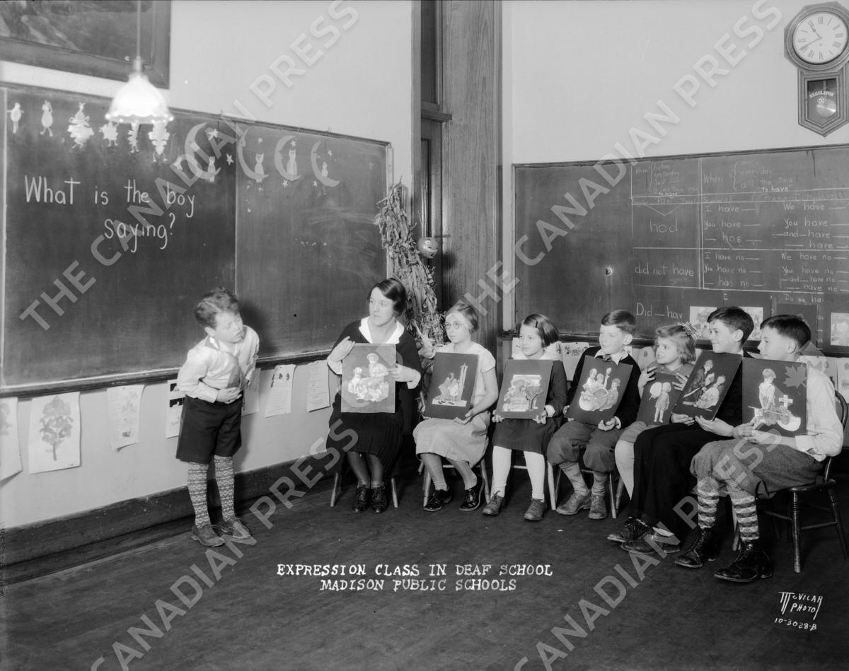 PREMIUM -- WHS#18334: Teacher and seven students holding pictures in "Expression class" in deaf classroom at Doty school. Madison, Wisconsin, 1931. Wisconsin Historical Society/Courtesy Everett Collection.