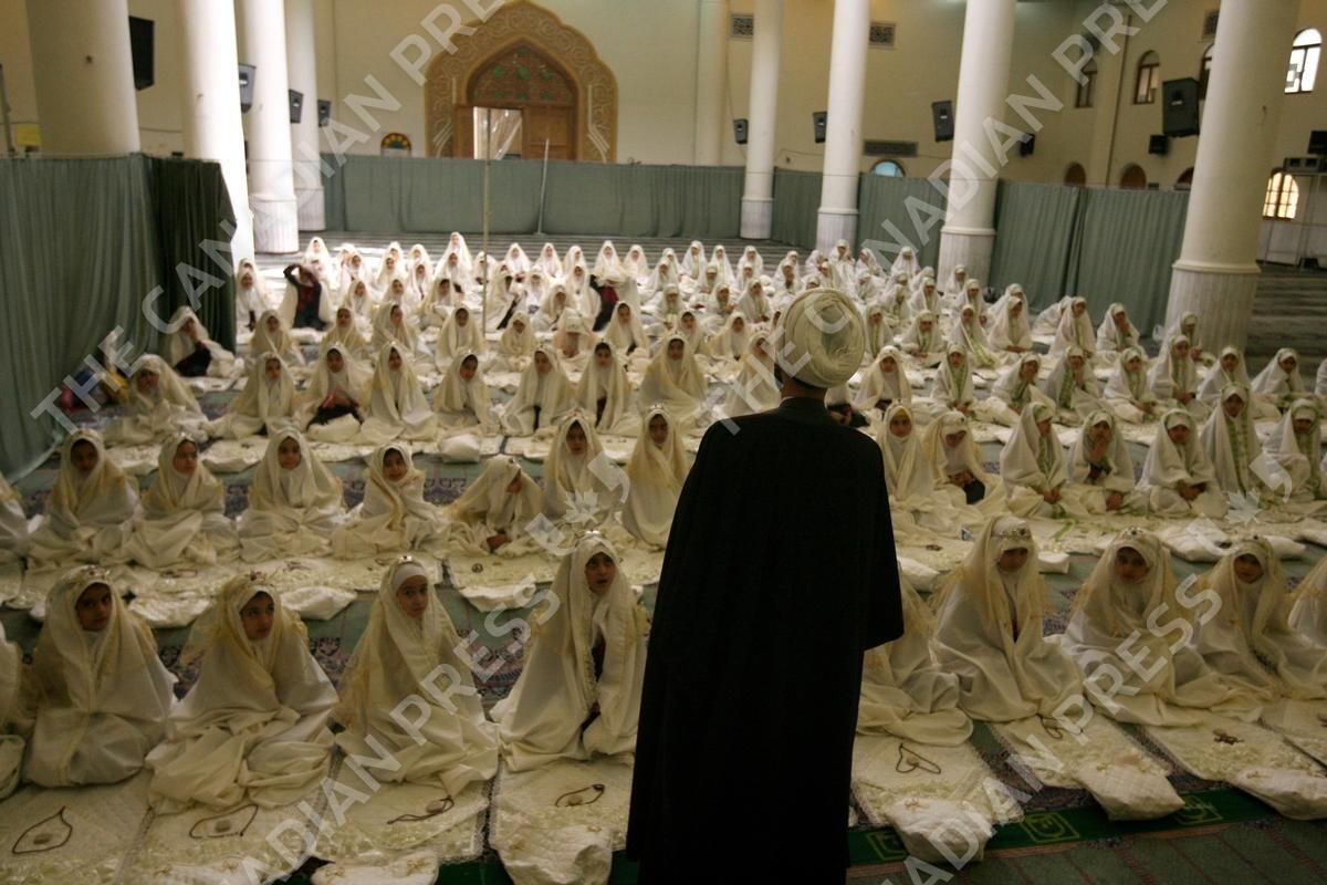 An Iranian clargyman speaks for school girls in a mosque in Isfahan, Iran on 29 February, 2012. When a Muslim girl reaches puberty, she has to wear the head scarf and cover her body but the face and hands. In the Shiite dominated Iran, schools held a festivity to celebrate the puberty of the schoolgirls at the age of nine in which they call it "Jashn-e Taklif" (Responsibility celebration). According to the Islamic Sharia when a girl reaches the age of puberty (which is around nine in Iran), she becomes a woman and must start saying her daily prayers. even though some families, whom are not religious, accompany their girls in school to celebrate it. The festival has become a special day for schoolgirls that they enjoy celebrating it but not all of them perform their prayers and cover their body after nine. Photo by Farzaneh Khademian/ABACAPRESS.COM # 318294_048