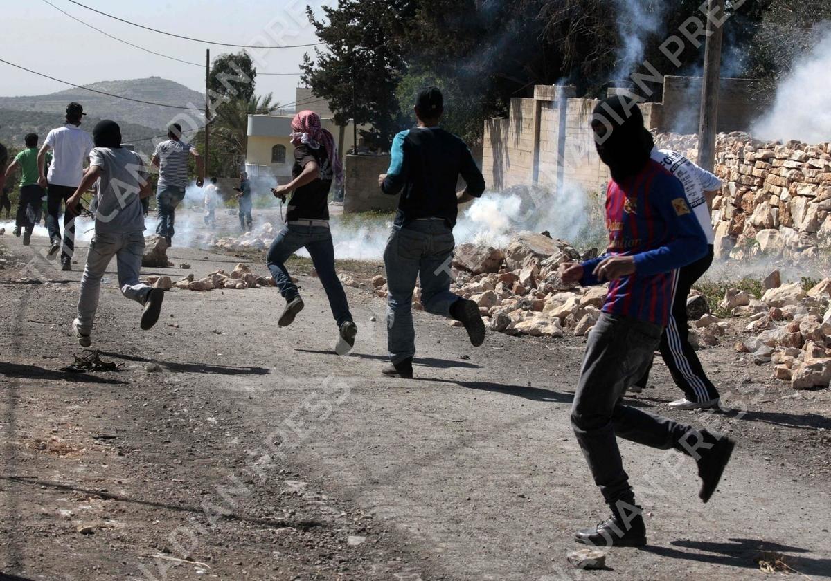 Palestinians protester throws a stone towards Israeli soldiers in their vehicle during clashes following a protest to mark Land Day, against the expropriation of Palestinian land by Israel in the village of Kafr Qaddum, near the occupied West Bank city of Nablus, on March 29, 2013. Photo by Nedal Eshtayah/AA/ABACAPRES. COM