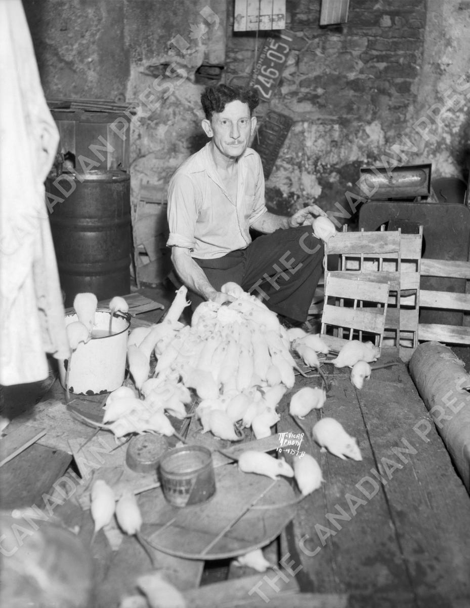 PREMIUM -- WHS#16423: John Harrison, 616 Williamson Street, with part of his brood of doomed white rats. City health department ordered their extermination. Madison, Wisconsin, 1934. Wisconsin Historical Society/Courtesy Everett Collection.