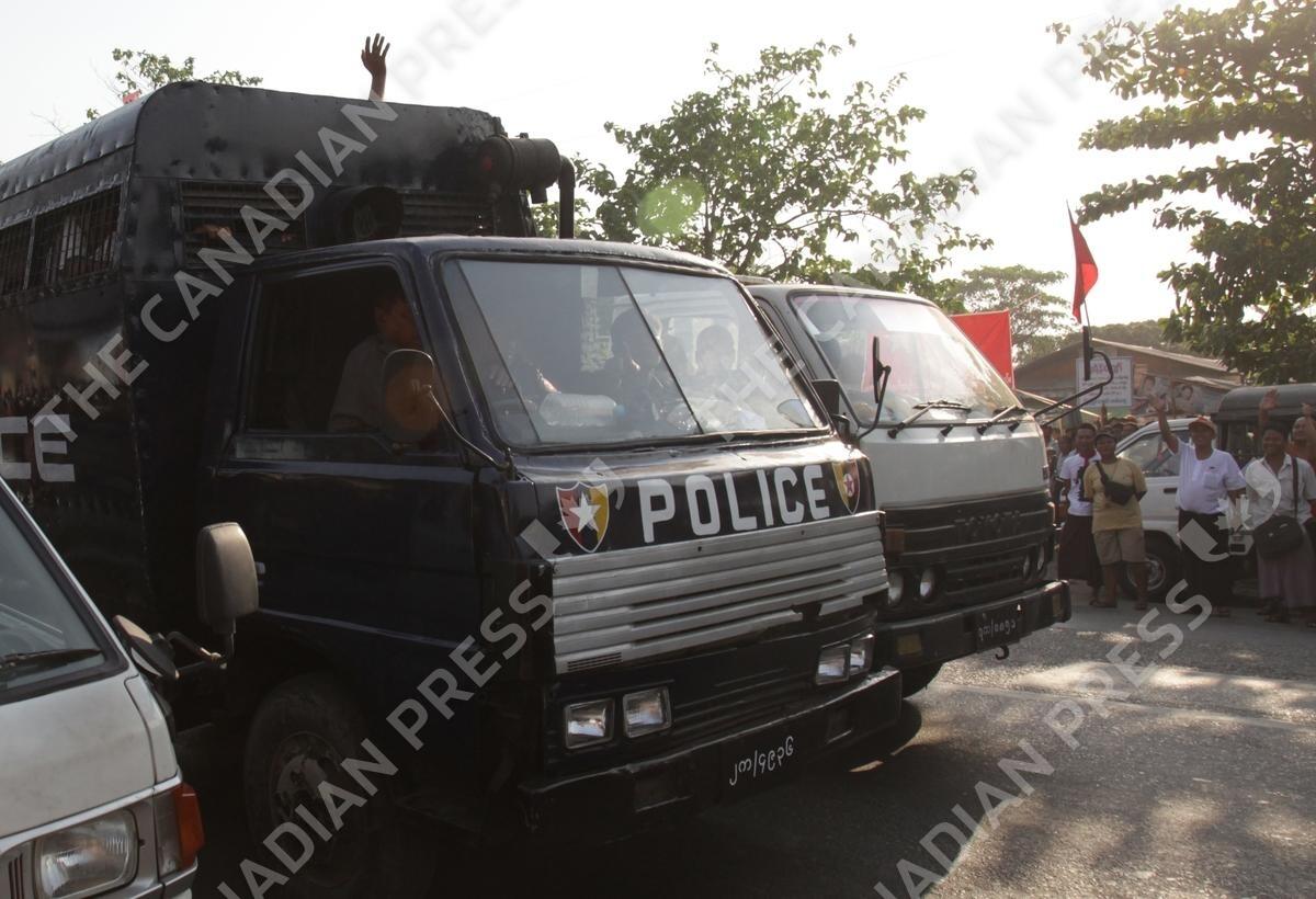 As a rallye of the NLD (the party of Aung San Suu Kyi) takes place on a street of Yangon on the eve of the by-elections, a sinister police truck carrying tatooed prisoners is passing by. NLD supporters in red wave to the prisoners in Yangon, Myanmar on March 30, 2012. Photo by Christophe Loviny/ABACAPRESS.COM # 315092_001