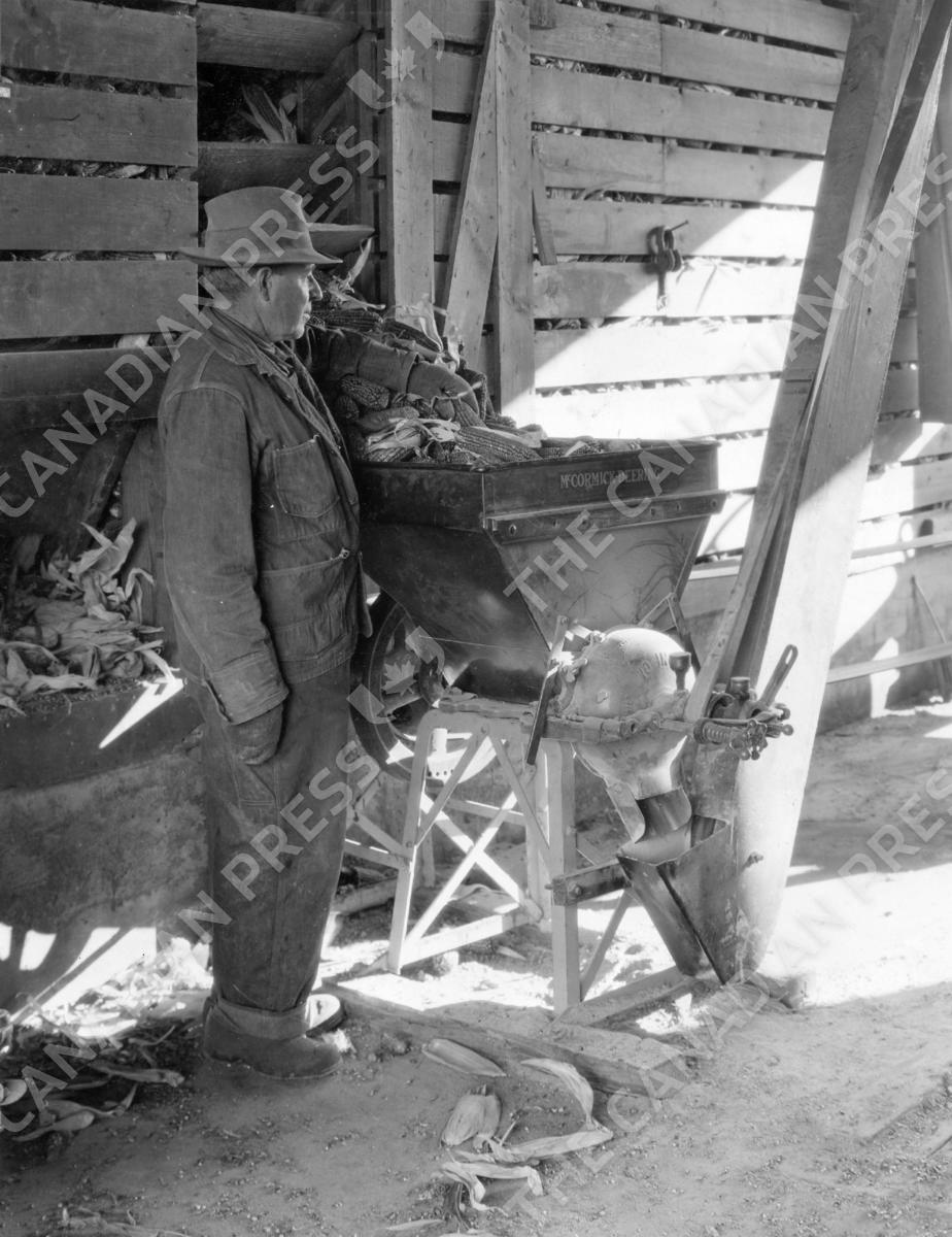 PREMIUM -- WHS#10929: Farmer Dave Fausch grinding corn with a McCormick-Deering 10-inch Type B feed grinder. Slater, Iowa, 1930. Wisconsin Historical Society/Courtesy Everett Collection.