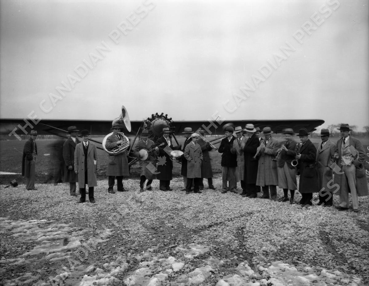 PREMIUM -- WHS#21818: Capitol Theater orchestra at Pennco Field (Royal Airport) to welcome the Ray-O-Vac Twins. Madison, Wisconsin, 1928. Wisconsin Historical Society/Courtesy Everett Collection.