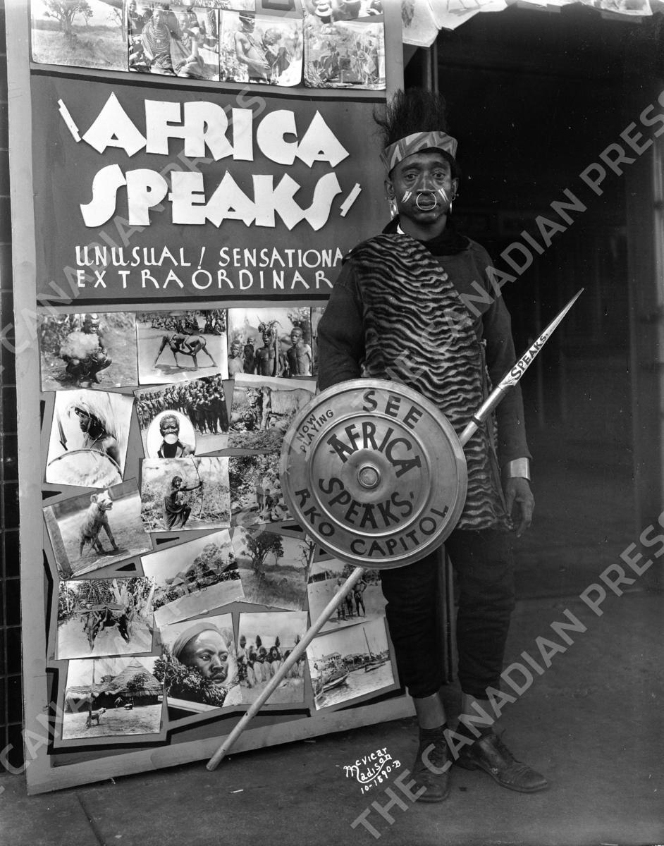 PREMIUM -- WHS#19970: Man dressed as an African standing beside poster advertising the movie, "Africa Speaks", in front of the Capitol Theatre, 209 State Street. Madison, Wisconsin, 1930. Wisconsin Historical Society/Courtesy Everett Collection.