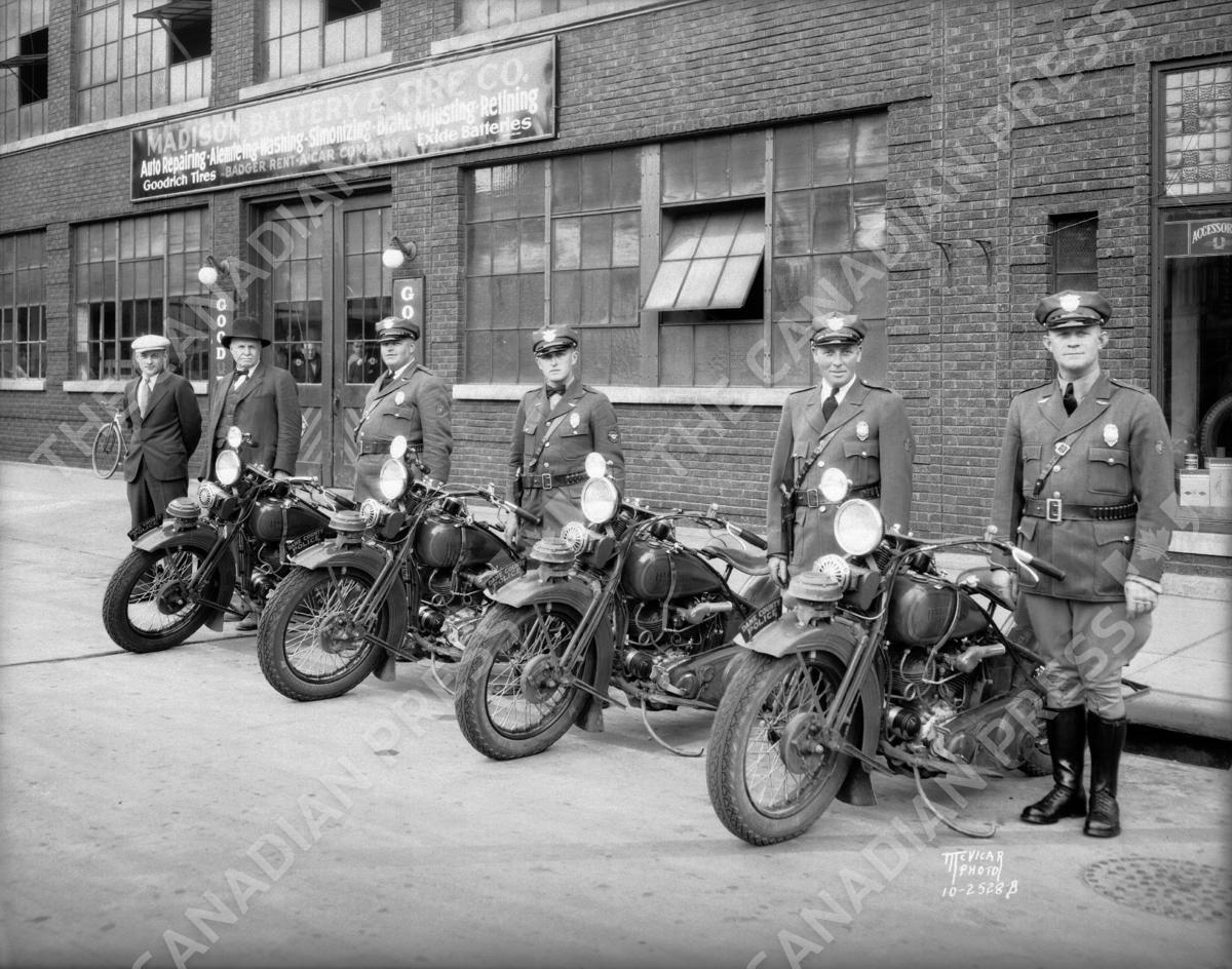 PREMIUM -- WHS#19219: 4 Dane County motor policemen shown with 4 Harley Davidson motorcycles and 2 other men taken in front of Madison Battery and Tire, 250 State Street. Madison, Wisconsin, 1931. Wisconsin Historical Society/Courtesy Everett Collection.