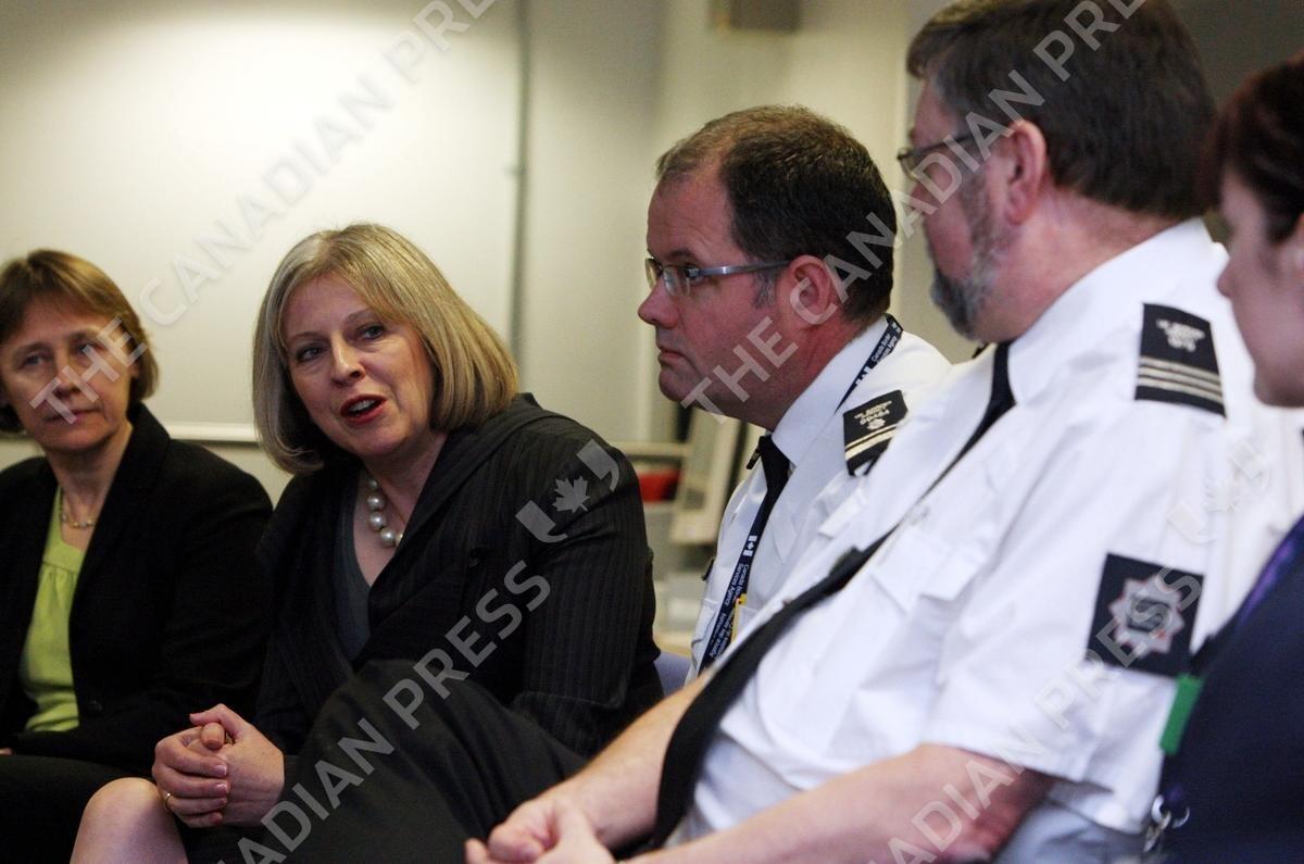 Home Secretary Theresa May, second left, visit the UK Border Agency staff at Terminal 5 of Heathrow Airport, London where they were shown differences between fake and real passports Tuesday Nov. 23, 2010. Britain's Home Office says it will be announcing the country's permanent immigration quota _ a new limit intended to dramatically reduce the number of non-EU nationals permitted to work in the U.K. (AP Photo/ Steve Parsons, Pool)