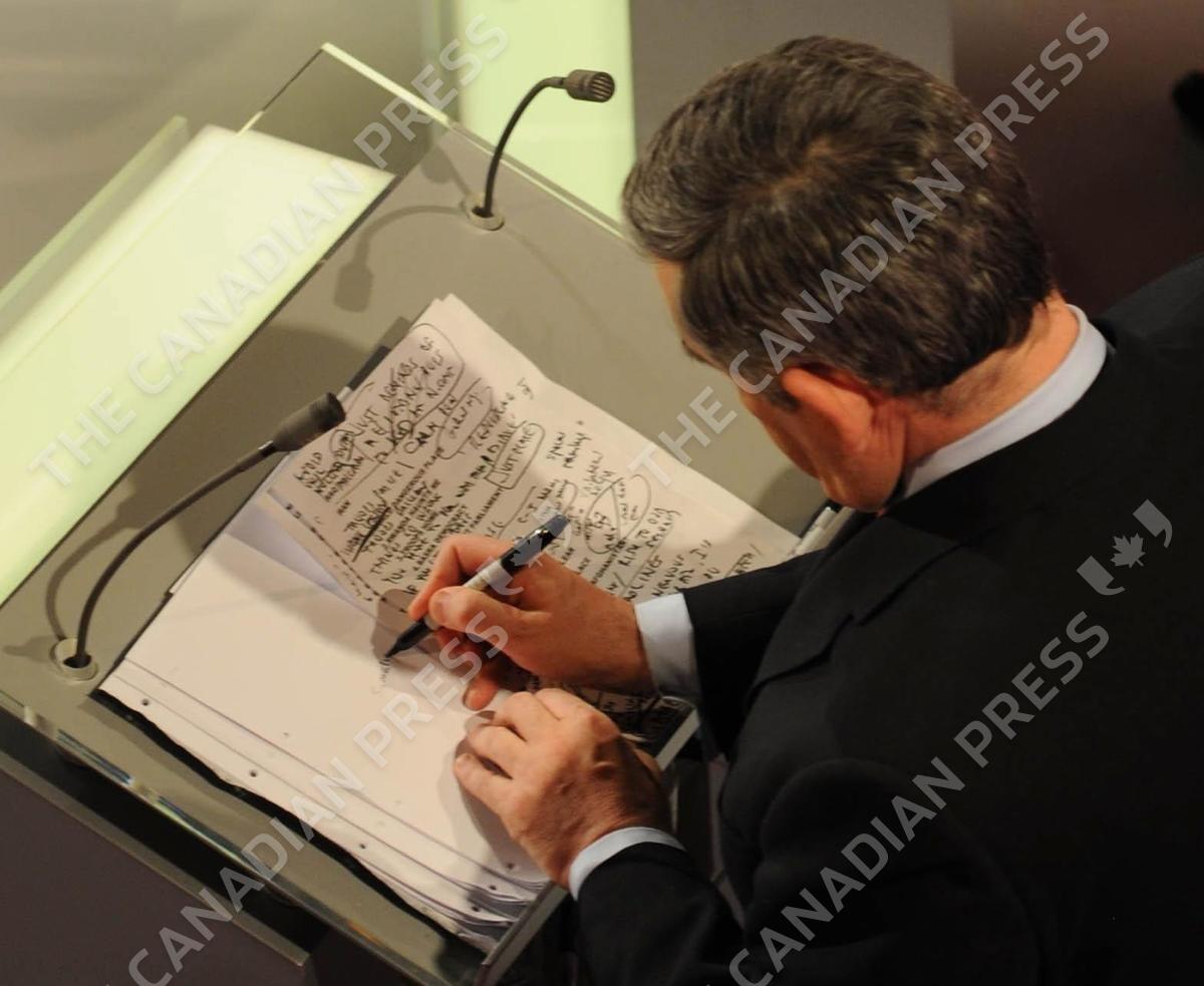 Britian's Labour party Prime Minister Gordon Brown uses his hand written notes as he takes part in Britain's second televised election debate in Bristol, England, Thursday, April 22, 2010, with unseen participants Conservative leader David Cameron, and Liberal Democrat Party leader Nick Clegg. The debate is broadcast live and could be a game-changer for the upcoming General Election on May 6, with candidates dueling over foreign affairs. (AP Photo / Stefan Rousseau, Pool)