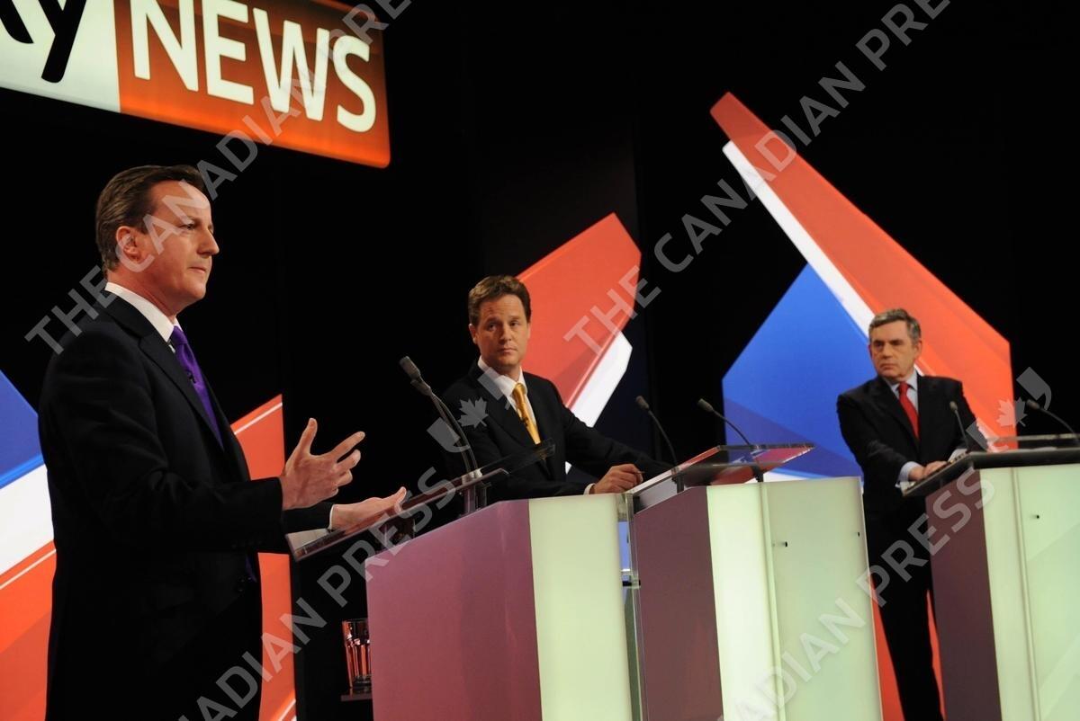 Labour's Prime Minister Gordon Brown, right, and Liberal Democrat Party leader Nick Clegg, centre, listen to Conservative leader David Cameron, left, during Britain's second televised election debate being braodcast from Bristol, England, Thursday, April 22, 2010. The debate could be a game-changer, with candidates dueling over foreign affairs. (AP Photo / Stefan Rousseau, Pool)