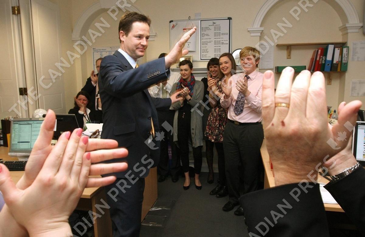 Britain's Liberal Democrat Leader Nick Clegg speaks to party workers at the Liberal Democrat Head Office in Westminster, London Tuesday April 6, 2010. Britain's first national election in five years will take place on May 6, British Prime Minister Gordon Brown planned to announce Tuesday, launching a monthlong campaign that could end in his ouster and the return of the opposition Conservative Party to power for the first time in 13 years. (AP Photo/ Dominic Lipinski, Pool)