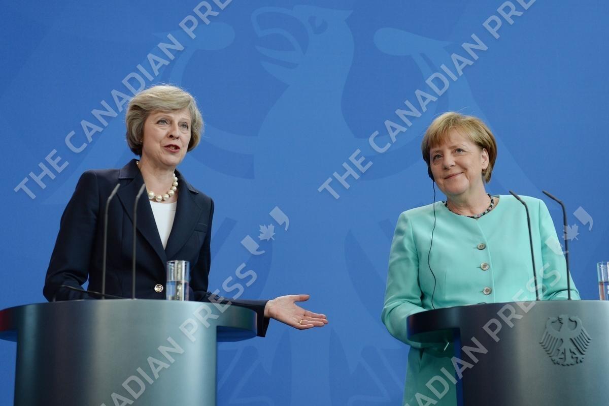 Prime Minister Theresa May and German Chancellor Angela Merkel hold a news conference at the Chancellery in Berlin after having talks.