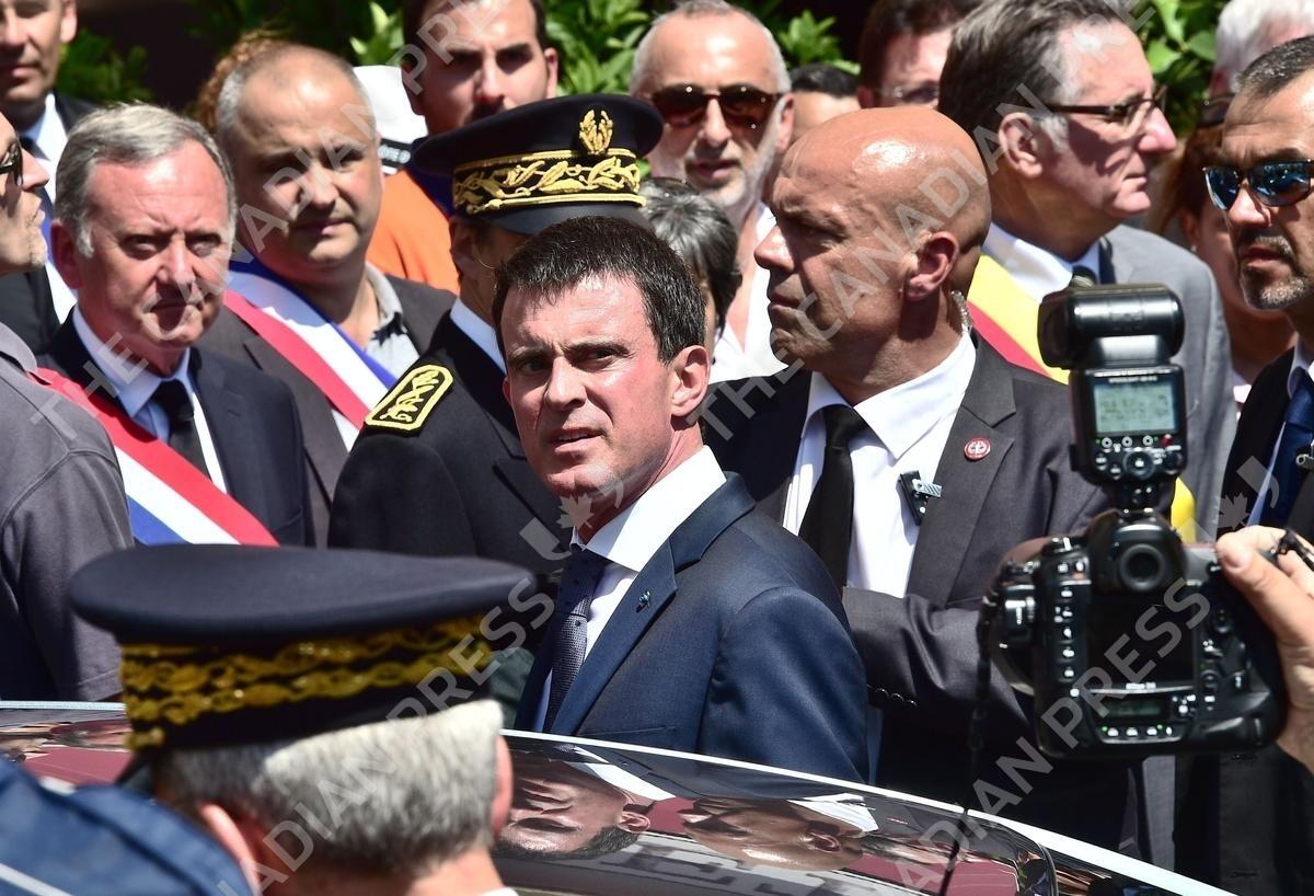 French Prime Minister Manuel Valls leaves after a one minute's silence in Nice, France, as people return to the scene where scores of people were mown down by a lorry to remember victims.