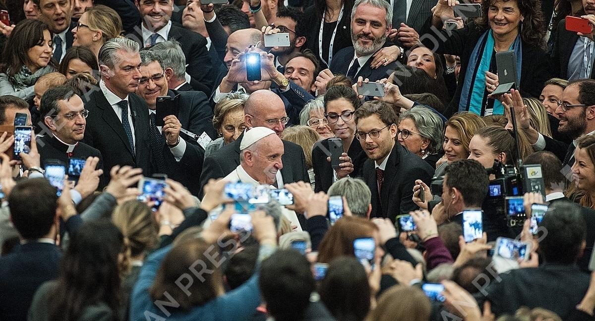 Pope Francis arrives for meeting with members of the Italian Entrepreneurs Association and he is photographed by many cell in the Paul VI hall at the Vatican.