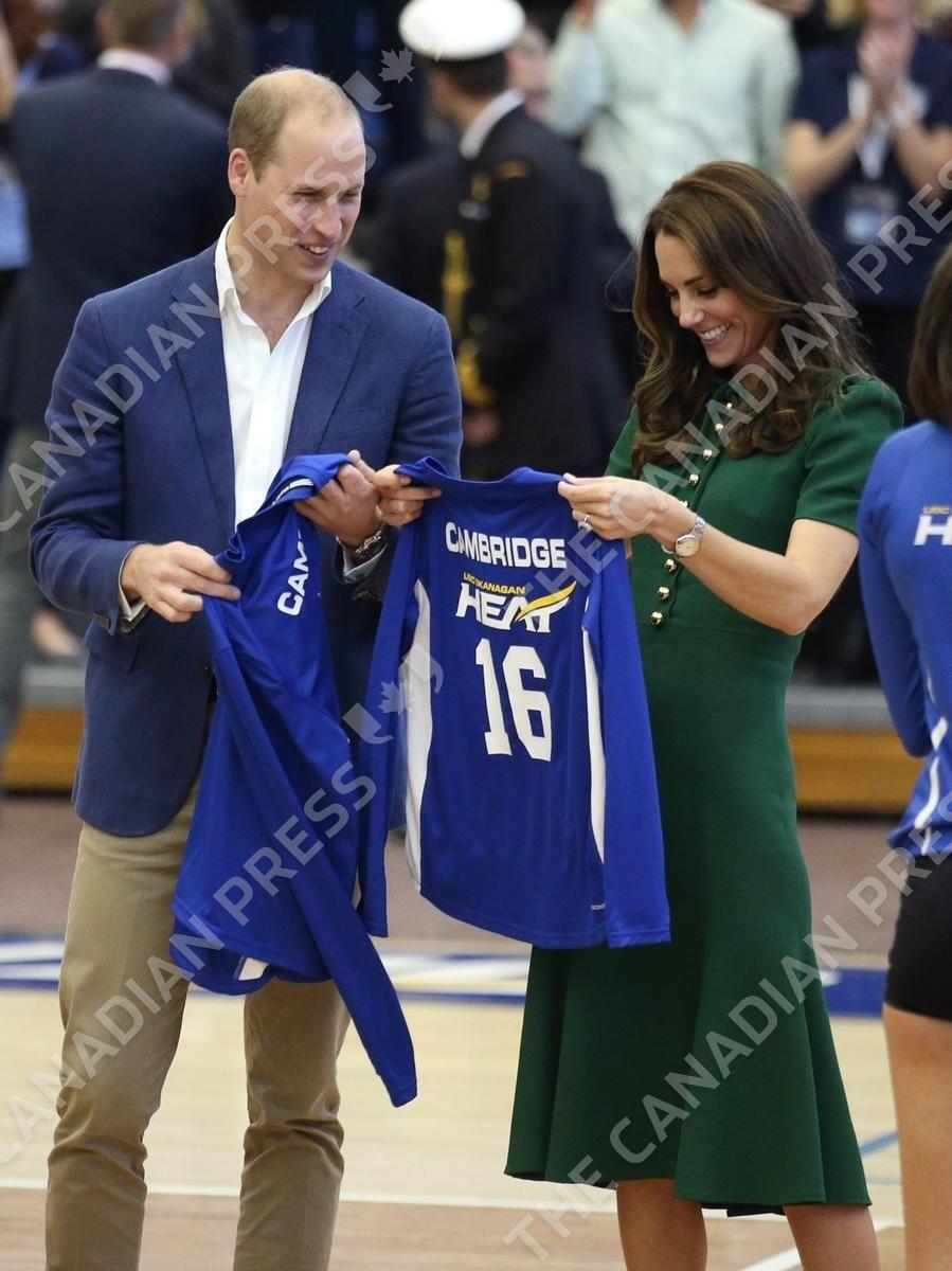 The Duke and Duchess of Cambridge are presented with personalised shirts as they meet members of the women's volleyball team at the University of British Columbia during a visit to its campus in Kelowna, Canada, on the fourth day of the royal tour to Canada.