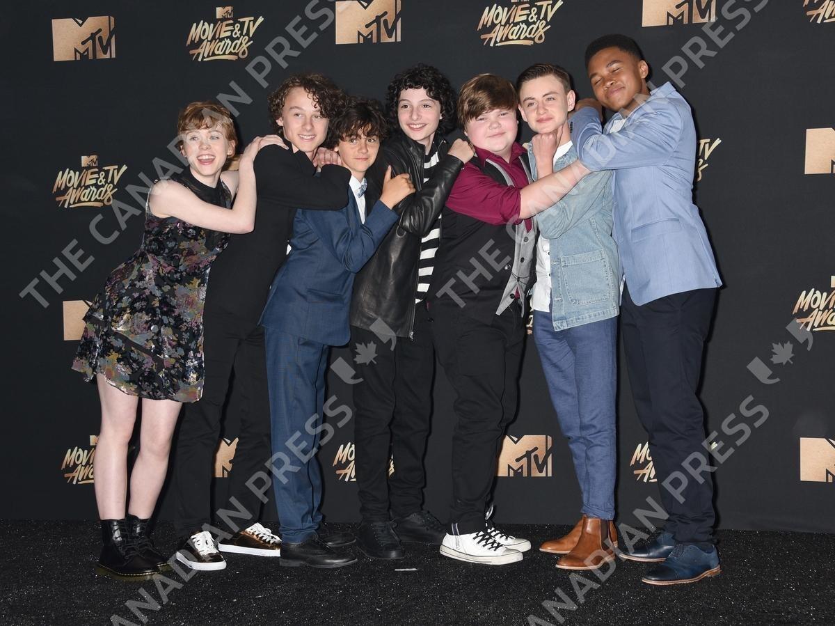 Sophia Lillis, Wyatt Oleff, Jack Dylan Grazer, Finn Wolfhard, Jeremy Ray Taylor, Jaeden Lieberher and Chosen Jacobs in the press room at the 2017 MTV Movie and TV Awards held at the Shrine Auditorium in Los Angeles, USA