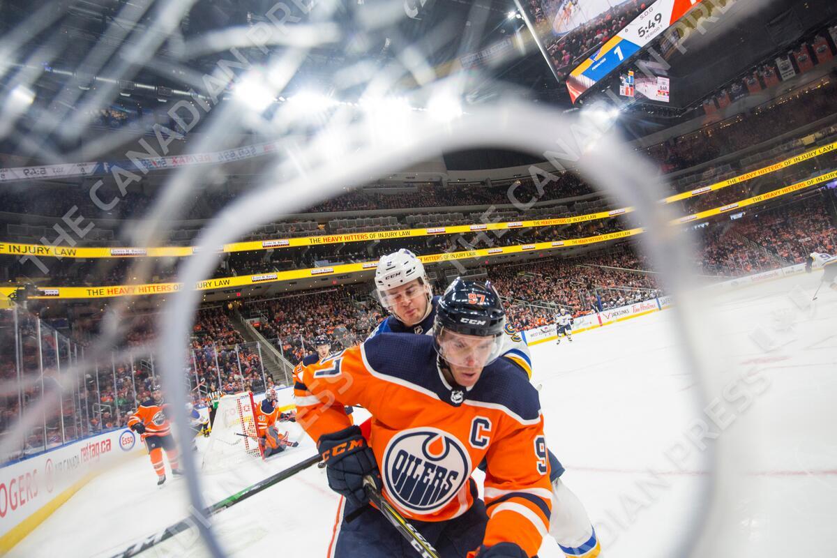 St. Louis Blues' Sammy Blais (9) checks Edmonton Oilers' Connor McDavid (97) into the boards during first period NHL hockey action in Edmonton, Alta., on Wednesday November 6, 2019. THE CANADIAN PRESS/Amber Bracken