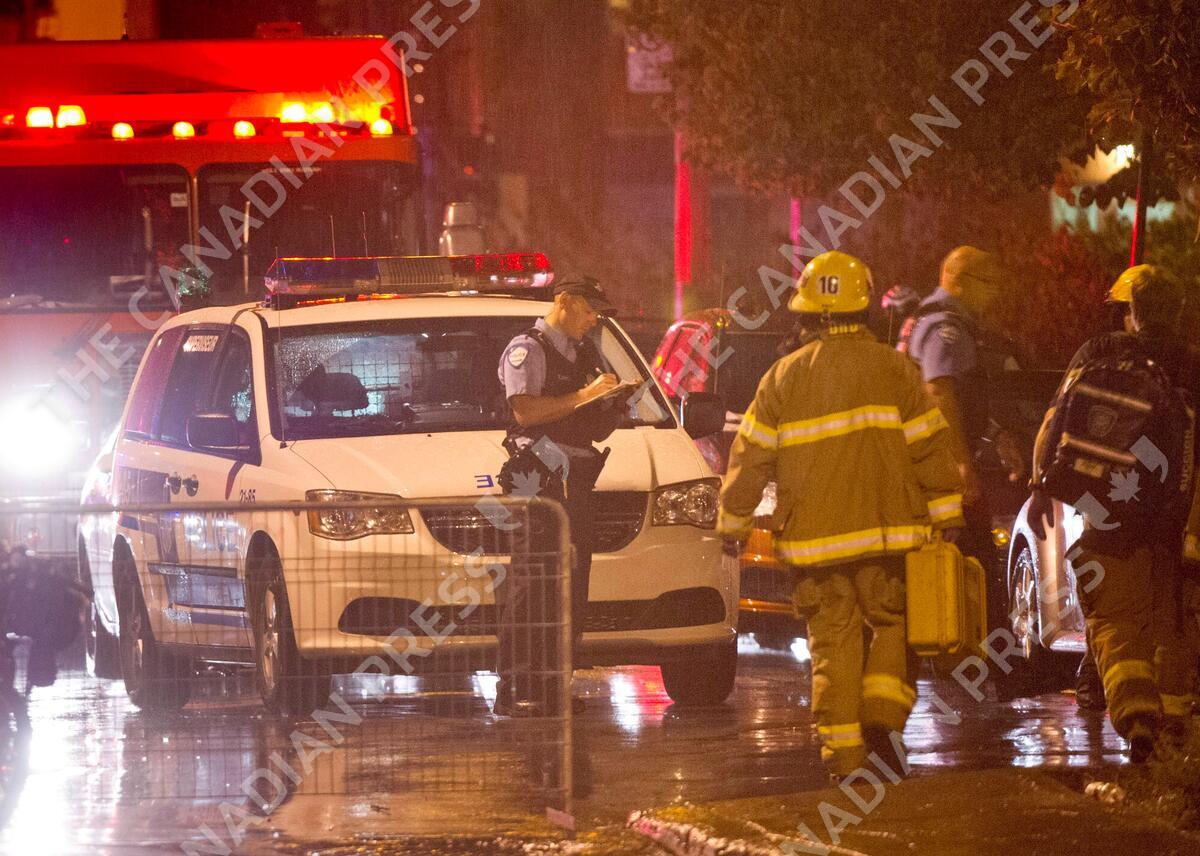 Police and fireman work at the rear of an auditorium where a gunman shot and killed at least one person during the PQ victory rally in Montreal on September 5, 2012. THE CANADIAN PRESS/Paul Chiasson