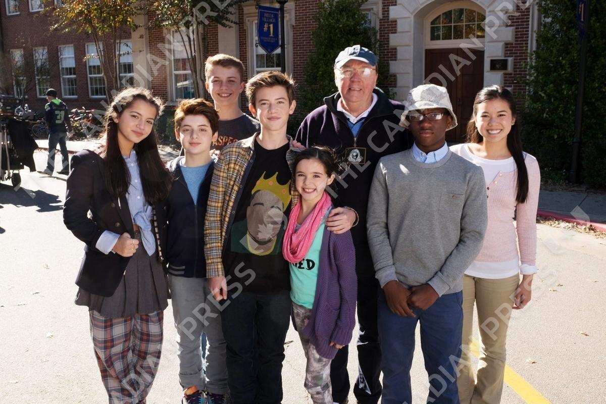 MIDDLE SCHOOL: THE WORST YEARS OF MY LIFE, from left: Isabela Moner, Thomas Barbusca, Jacob Hopkins, Griffin Gluck, Alexa Nisenson, writer James Patterson, Luke Hardeman, Jessi Goei, 2016. ph: Frank Masi / © CBS /Courtesy Everett Collection