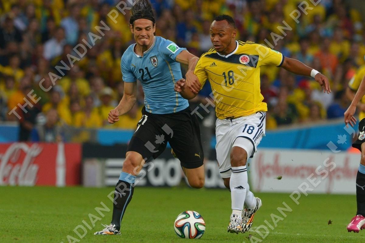 Colombia's Camilo Zuniga battling Uruguay's Edinson Cavanduring Soccer World Cup 2014 1/8 of final round match Colombia v Uruguay at Maracana Stadium, Rio de Janeiro, Brazil on June 28, 2014. Colombia won 2-0. Photo by Henri Szwarc/ABACAPRESS.COM