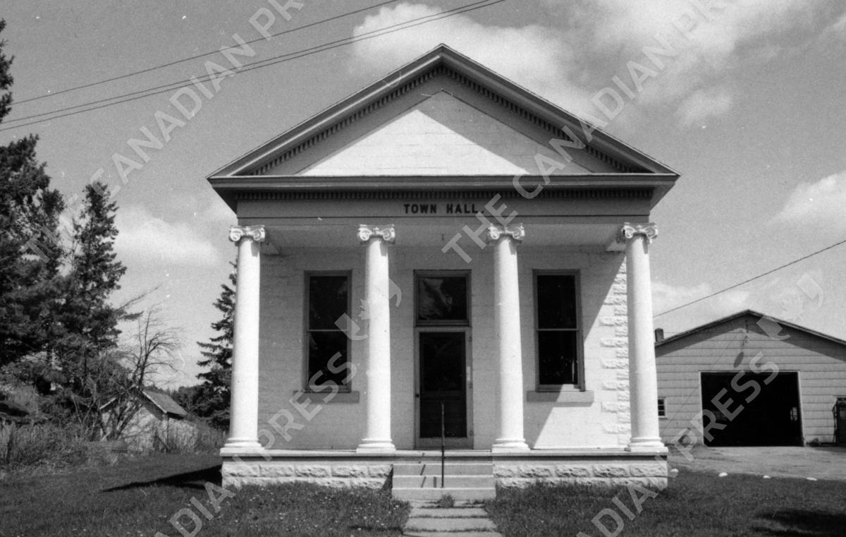 PREMIUM -- WHS#3533: Front view of the La Pointe Town Hall on Madeline Island. La Pointe, Wisconsin, 1973. Wisconsin Historical Society/Courtesy Everett Collection.