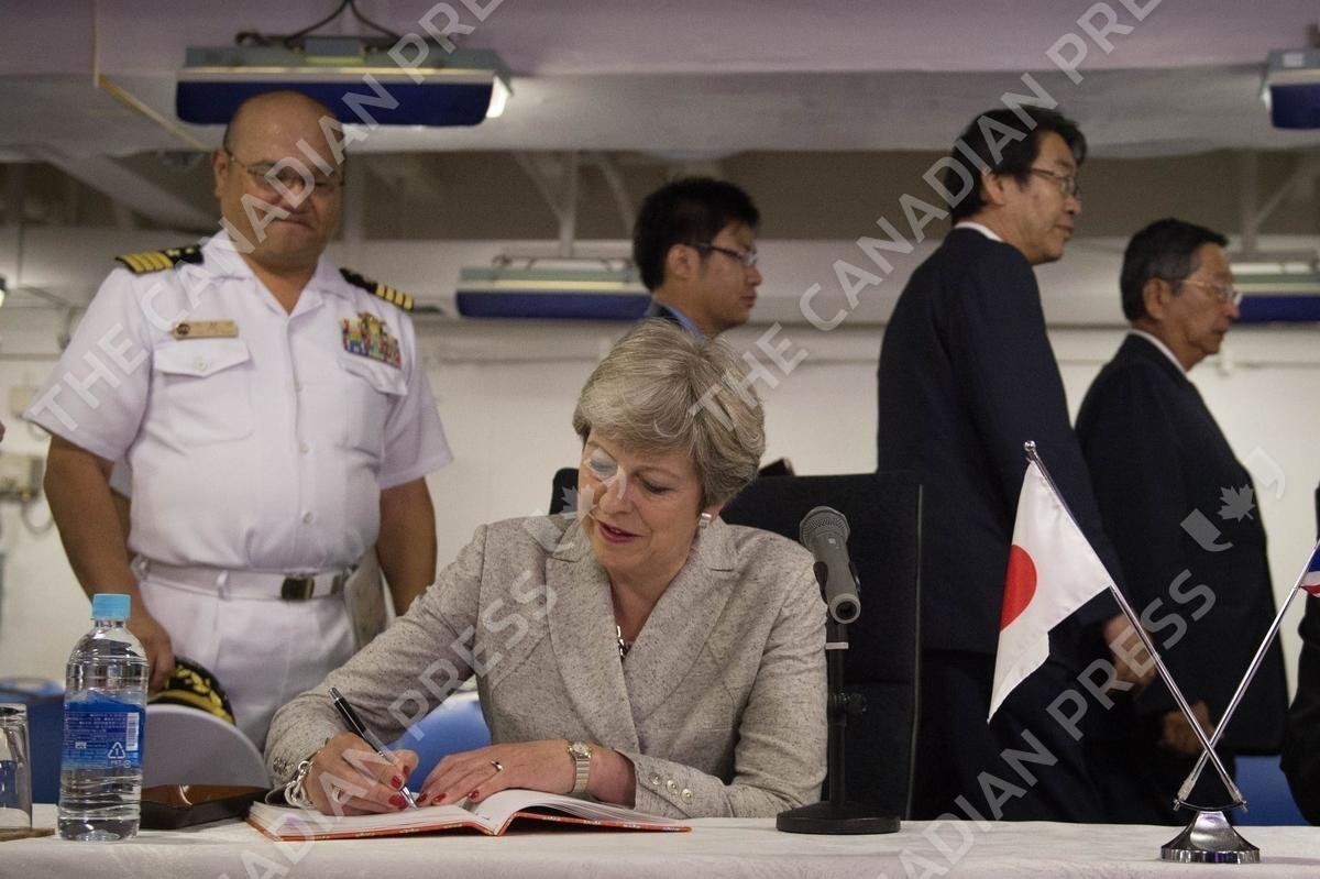 Prime Minister Theresa May signs a visitor's book after meeting crew and naval personnel including those from the British Royal Navy on board the Japanese aircraft carrier, J.S. Izumo at Yokosuka Naval Base near Tokyo.