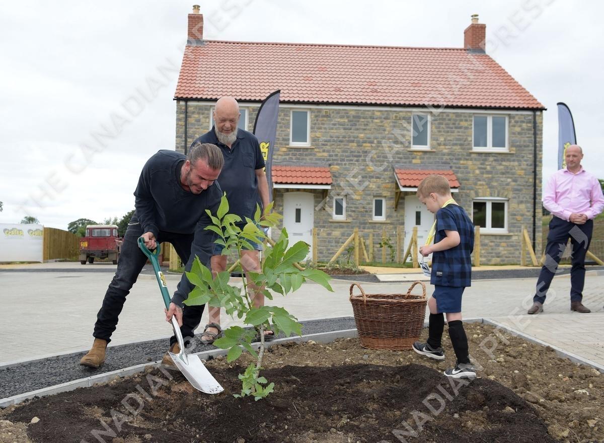 David Beckham (left) and Michael Eavis (second left) plant a tree outside a completed house in a housing development in Pilton village in Somerset.