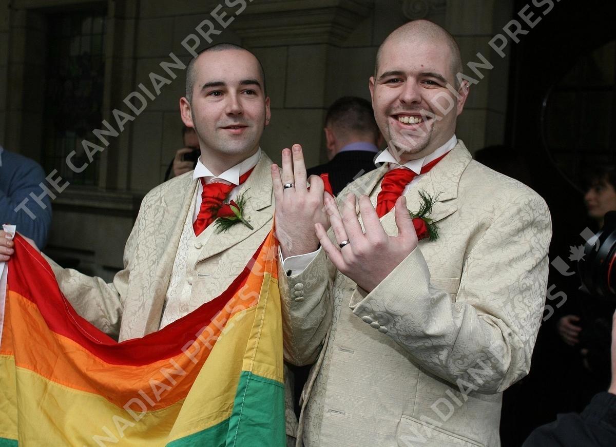 File photo dated 19/12/05 of Henry Edmond Kane (left) and partner Christopher Patrick Flanagan outside Belfast City Hall after their civil partnership ceremony.