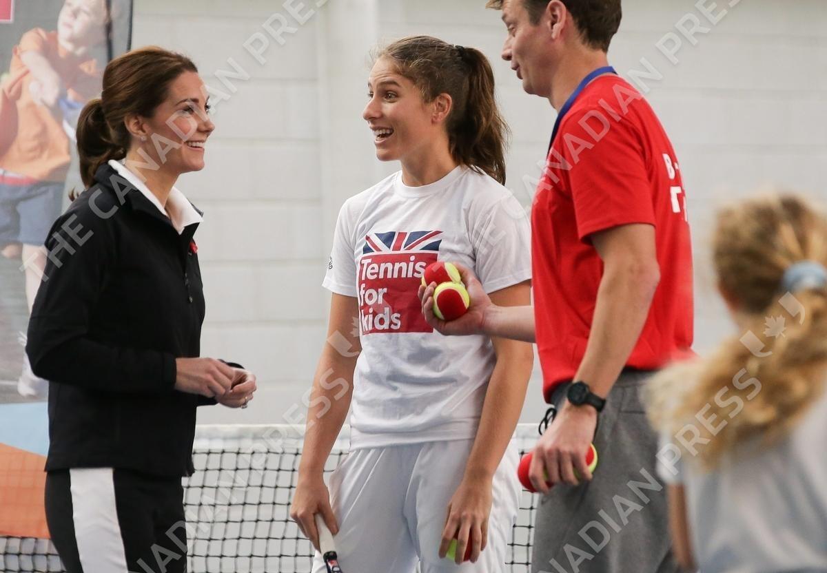 The Duchess of Cambridge (left) speaks with British player Johanna Konta (centre) as she prepares to take part in a Tennis for Kids session during a visit at the Lawn Tennis Association (LTA) at the National Tennis Centre in southwest London.
