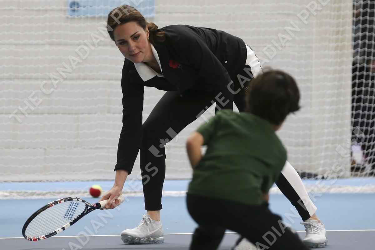 The Duchess of Cambridge takes part in a Tennis for Kids session during a visit at the Lawn Tennis Association (LTA) at the National Tennis Centre in southwest London.