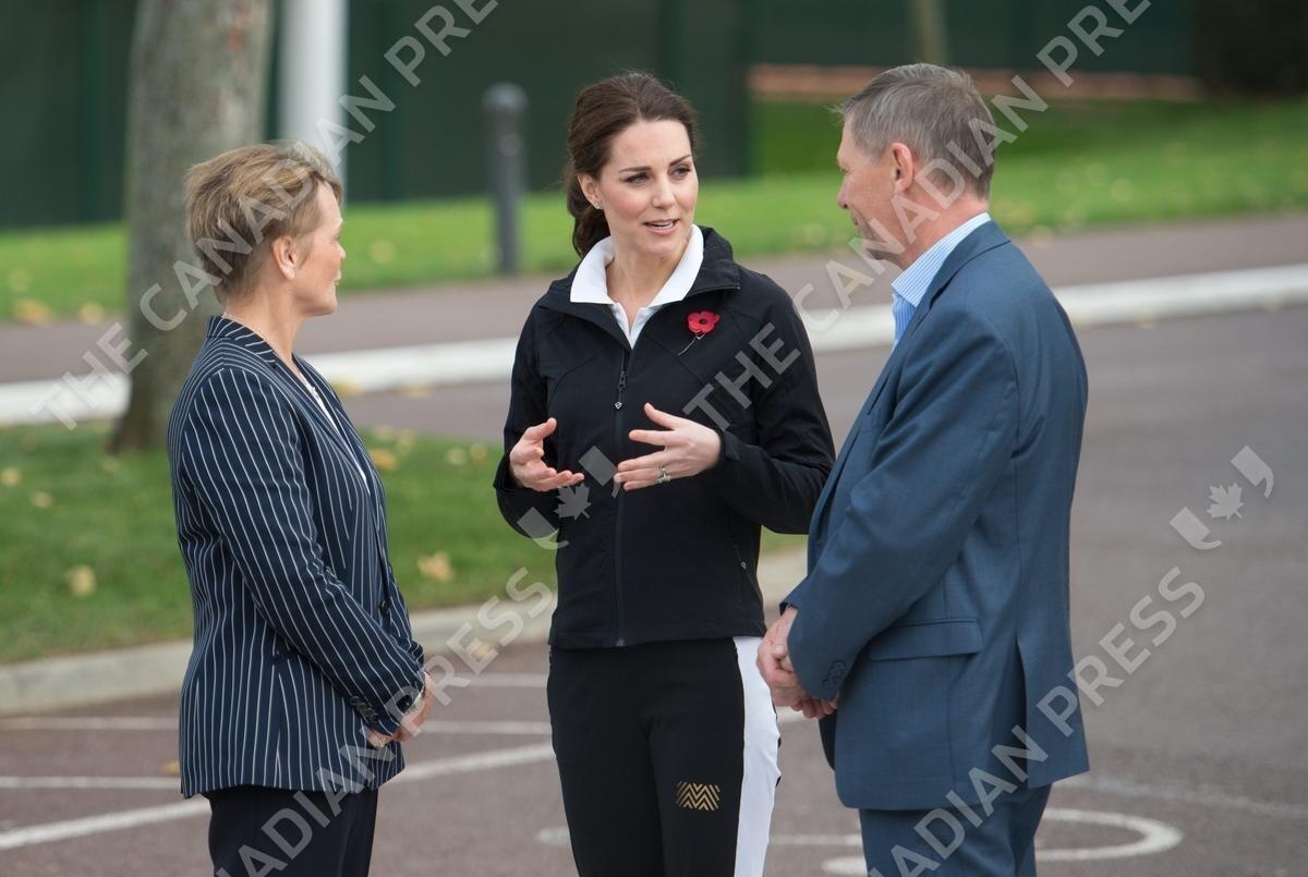Catherine, Duchess of Cambridge chats to Martin Corrie, the president of the LTA, and Vicky Williams, director of human resources, during a visit to the Lawn Tennis Association National Tennis Centre in London on October 31, 2017.